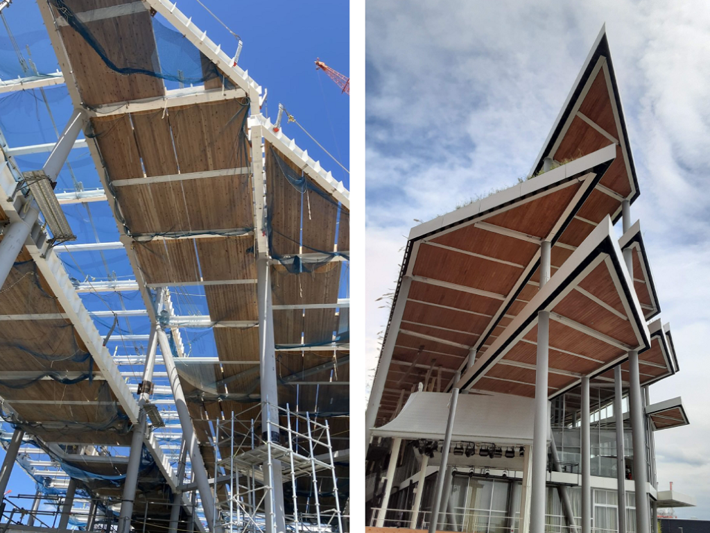 あの建物の木材パネルの部分ですが、弊社が加工に携わらせていただきました。